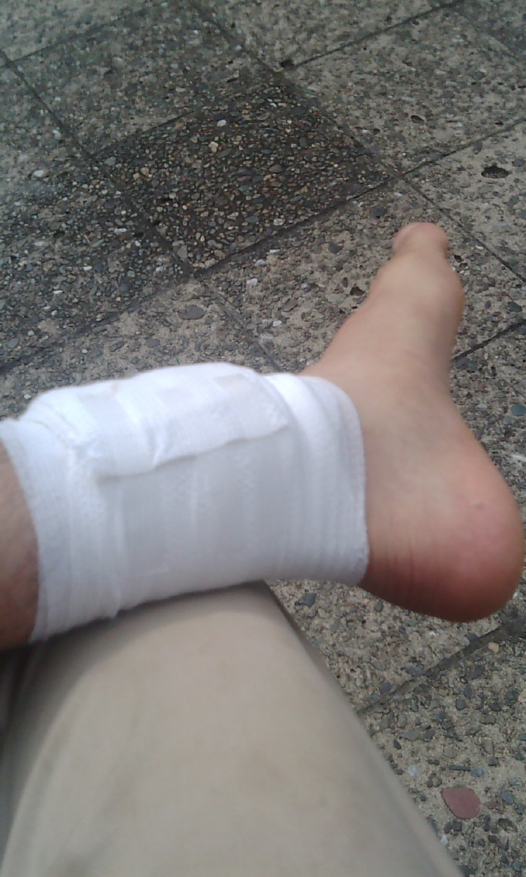 デスクグラインダーがズボンに巻きつき運の悪い事に切断角度で回り続けました。