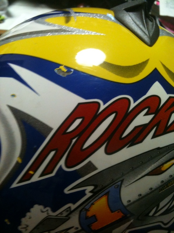 激しく傷が付いているんですが脳震盪もおこさずすみました。やはりヘルメットはオートバイ用に限ります。